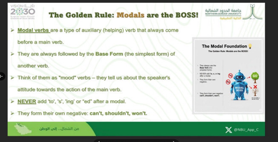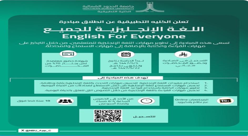 تعلن الكلية التطبيقية عن انطلاق مبادرة اللغة الإنجليزية للجميع English For Everyone وتسعى هذه المبادرة إلى تطوير مهارات اللغة الإنجليزية للمتعلمين، بالتركيز على مهارات القراءة والكتابة والاستماع والمحادثة من الأحد إلى الخميس لـ14 يومًا 6-4مساءً عن بعد #جامعة_الحدود_الشمالية